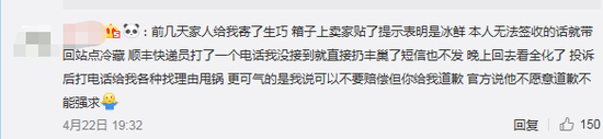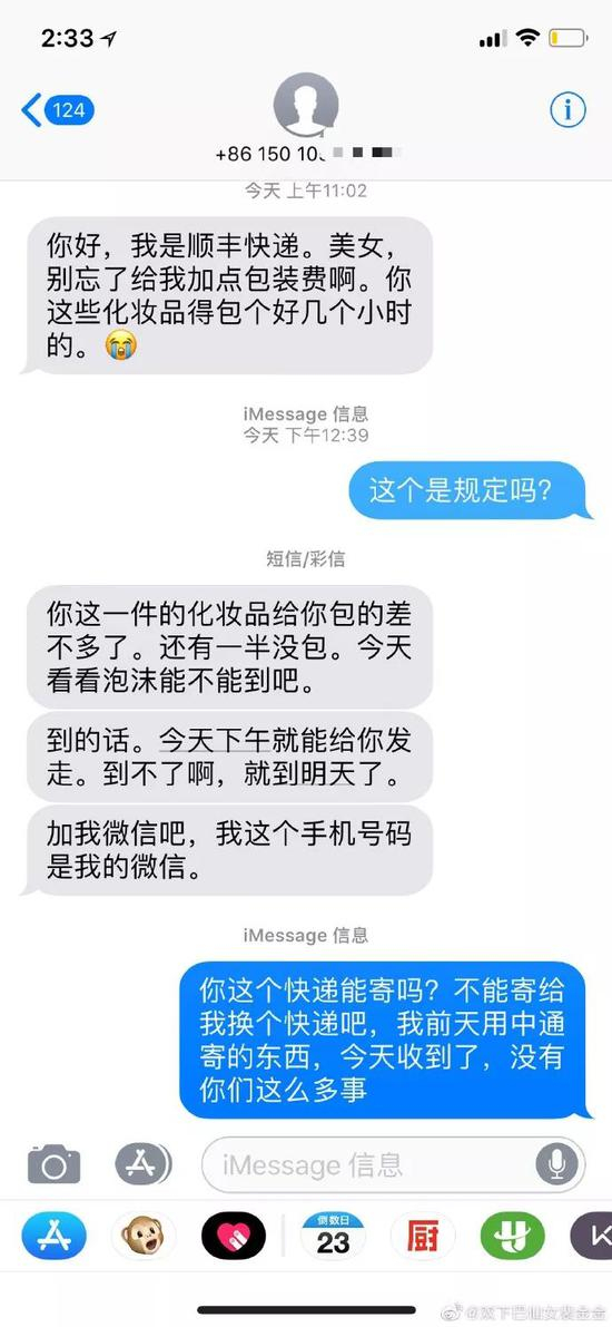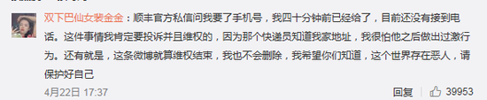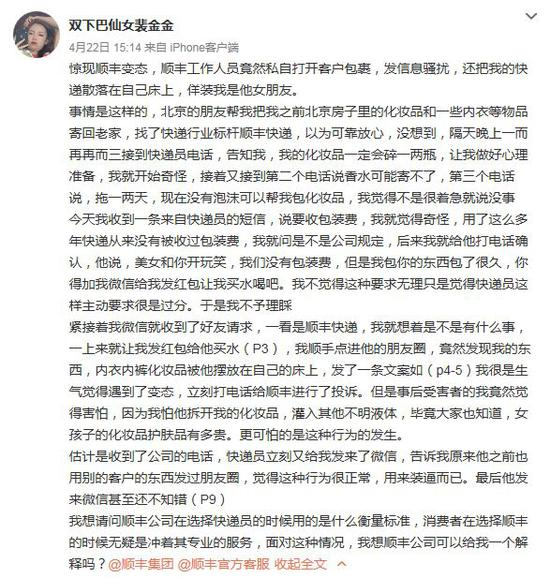 4月22日,微博用户@双下巴仙女裴金金 称顺丰快递员私自打开客户包裹,并加她微信发信息骚扰。