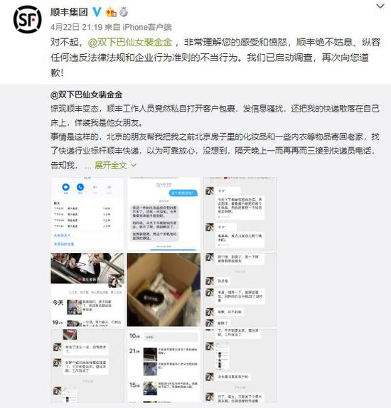 对此,顺丰官方昨晚21时许通过微博表示道歉,称“顺丰绝不姑息、纵容任何违反法律法规和企业行为准则的不当行为。我们已启动调查。”