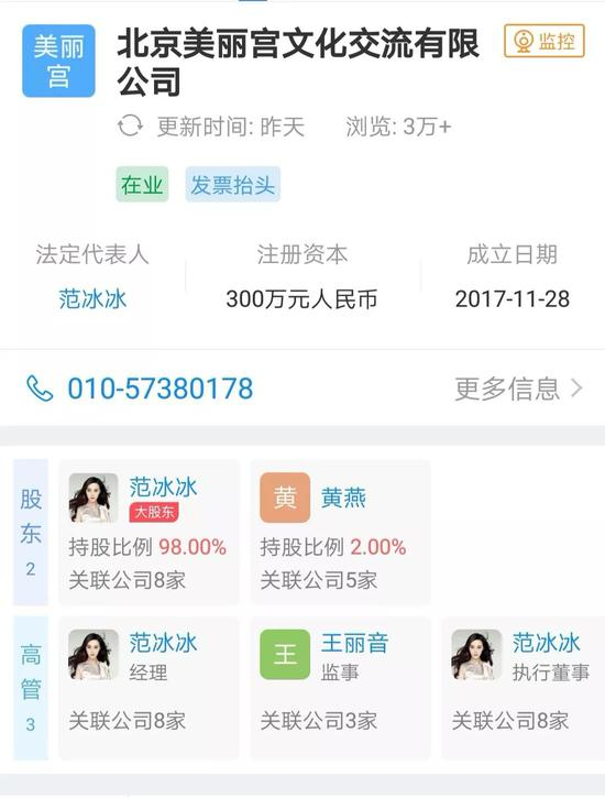 其中,北京美丽宫文化交流有限公司的法定代表人即为范冰冰,这家公司成立于2017年,注册资本为300万元。经营范围包括:组织文化艺术交流活动(不含演出);文艺创作;技术开发、技术咨询、技术服务;会议服务;承办展览展示活动;市场调查;企业策划。