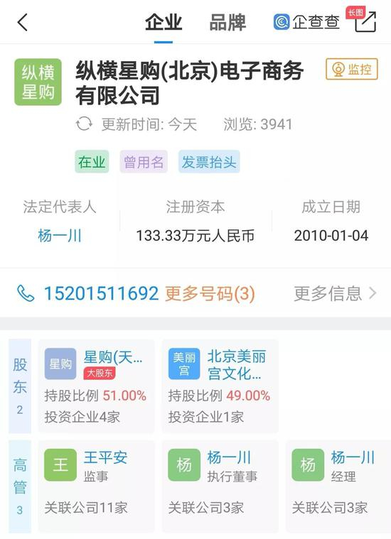 而该公司的股东分别为星购(天津)科技有限公司以及北京美丽宫文化交流有限公司,持股比例分别为51%和49%。