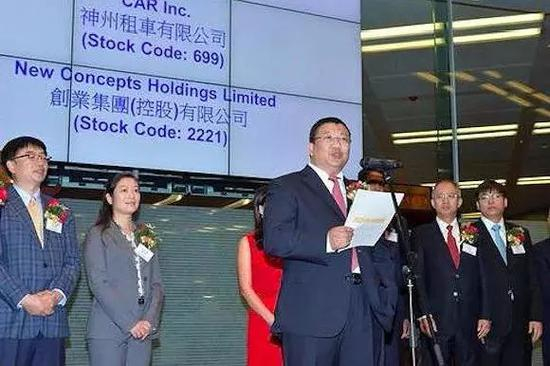 △神州租车香港上市敲钟现场,讲话者为陆正耀,左二为钱治亚。