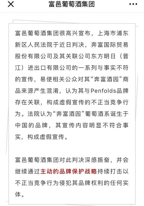 4月26日,澳大利亚葡萄酒上市公司富邑集团(Treasury Wine Estates,简称TWE)在官方微信公众号发文称,上海市浦东新区人民法院近日判决,奔富公司及其关联公司东方明日(晋江)进出口公司(简称“东方明日”)的一系列与事实不符的宣传,易使相关公众认为其“奔富酒园”商品与富邑Penfolds品牌存在关联,因此构成虚假宣传的不正当竞争行为。
