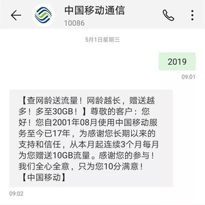 中国移动5月1日起推出“查网龄送流量”活动,活动截至2019年12月31日结束。2018年12月31日之前入网的手机客户都可参加,网龄越长、优惠越多,最高可获赠30GB流量。