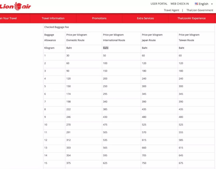 这又怎么说呢?记者了解到,狮航于今年1月15日起取消了经济舱的免费箱子托运。在狮航的官方网站上可以找到关于托运收费的价目表,泰国国内的托运价是30泰铢(折合6.40元人民币)/公斤,国际托运价则是50泰铢(折合10.68元人民币)/公斤。