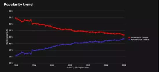但现实并不如他所料。Gartner 的分析指出,2014年商业数据库市场容量大约300亿美元,到2021年将会衰减到220亿美元左右,它正逐渐被开源数据库和云原生数据库追平。在商业数据库中市场占有率超五成的Oracle自然也很难独善其身。