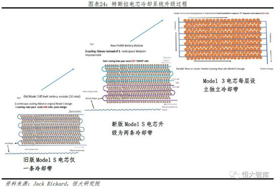 此外,由于电池单体材料升级、体积增大,电芯容量和密度大幅提高,导致电池化学热敏感性提升,可燃点从18650电池的约175℃降低为2170电池的约65-82℃,对电池冷却系统提出更高要求。对比旧版Model S 85、新版Model S P100与Model 3可以发现,电池冷却系统阶段性升级,从早期的单条冷却带到如今的每层独立冷却带,为新版2170电池提供更好的温度管控,极大提高电池冷却运行效率。