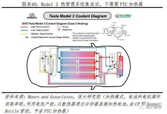 四、热管理系统温差设计合理,冷却路线丰富流畅,均温和能量管控能力突出。新能源汽车的热管理系统主要包括整车、座舱、电池三方面,进行整车温度控制、客舱空调加热制冷、电池过热散热过冷加热等。目前,主流热管理包括自然冷却、液冷和直冷三种方案,特斯拉采取50%水和50%乙二醇为冷却液的液冷方案,由四通阀实现的电机和电池冷却循环串并联结构。由系统芯片算法控制,当电池温度超过设定目标值时,电池循环与电机循环相互独立,采用并联;电池温度低于设定目标值时,电池循环与电机循环采取串联,利用电机余热为电池和座舱加热,多余热量将由进气口的热量交换器排放出去。此方案充分利用车内所有部件热量,使热量有效循环游走,极大提高电池单体散热性和电池单体间温度一致性。因此,无论冬季还是夏季所对应的极端气候,特斯拉车辆温差控制保持在2℃内,体现强大的温度管控能力。