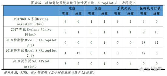 从车道保持情况来看,根据美国公路安全保险协会IIHS数据,在直径1300-2000英尺(396-617米)不同的空旷道路测试环境下,对比宝马5系、奔驰E、Model 3/S和沃尔沃S90五辆同类别轿车,设定3种情况各6种测试的共18次测试条件,Autopilot8.1辅助驾驶系统在弯道和坡道的车辆保持能力最为突出,仅在坡道表现过一次压线。