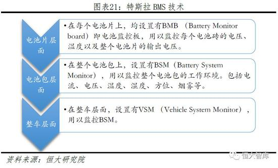 二、串并联组合、分层管理模式优化模组结构,提高电池充放电能力。特斯拉电池采用特有的串并联方式,按照“单体电池-brick-sheet-pack”顺序进行分层管理。例如,特斯拉将Roadster电池系统的6831节电池分成不同的子单元(4个模组中2个为23Brick/module,另外2个为25Brick/module,即2*23*31+2*25*31)进行并联和串联,多组串联和平板的设计,极大增加电池铺设数量和使用效率,从而提高整车动力性能和续航里程。