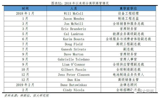 五、高层震荡频繁。特斯拉高层离职率呈增长趋势,仅2018年全年,离职高管超过40人。除正常的人员调动和行政方面高管离职,特斯拉核心团队的技术、财务、研发、法务管理人员均发生过离职,例如2016年5月离职的生产制造副总裁Greg Reichow与Josh Ensign、2017年4月离职的首席财务官JasonWheeler、2017年7月离职的电池技术总监Kurt Kelty、2018年9月离职的首席人事官Gabrielle Toledano等。即便高管离职跳槽在硅谷科创企业非常普遍,但是管理层频繁变动仍不利于特斯拉稳健发展。