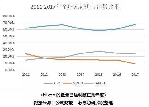 目前全球半导体前道用光刻机的生产厂商主要有ASML、尼康和佳能,其中尤其以ASML为佳,一家独占7成的市场。