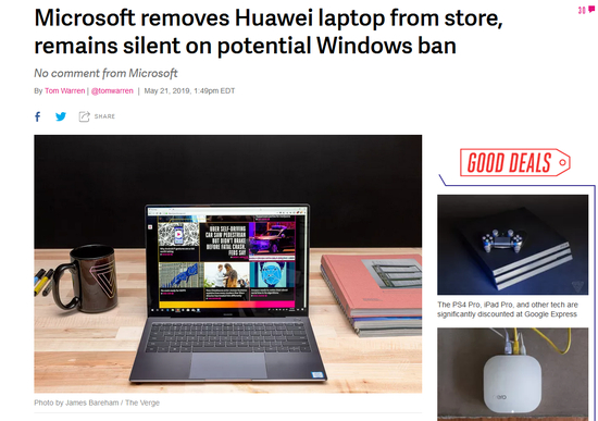 (观察者网讯)据美国科技媒体网站The Verge 5月21日报道,上周末,微软上周末从微软在线商店删除了华为笔记本电脑列表,甚至在微软商店中无法搜索到华为的任何硬件设备。