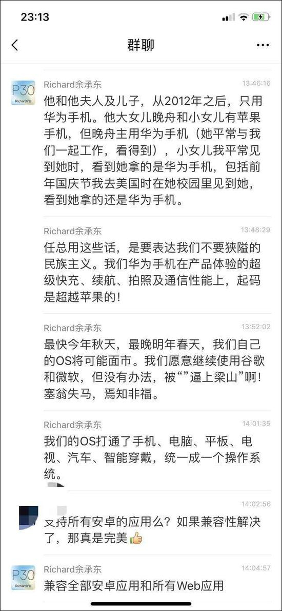 对此,昨日网络曝出截图,华为消费者业务CEO余承东透漏,“华为的自研OS操作系统最快今年秋天、最晚明年春天将面市。”