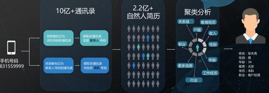 自称拥有中国最大的自然人简历库,巧达科技手握2.2亿自然人的简历,简历累计37亿份。这也意味着,假如某APP提供某用户手机号,巧达科技将其与自有的简历库进行匹配,便能反馈给APP这个自然人包括年龄、性别、行业、职业、户籍、收入、教育经历、工作经历、关系链等在内的信息。
