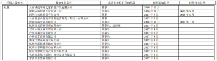 资料显示,杜胜出生于1968年7月,今年51岁,曾任景洪市给排水公司经理,景洪市城市投资开发有限公司总经理,云南省水务产业投资有限公司常务副总经理,云南民族文化旅游产业有限公司总经理,景洪市城市投资开发有限公司党委书记,深圳市云佳投资有限公司董事,成都银城置业有限公司董事长,深圳云城创建开发有限公司董事长等职务。现在除担任云南城投董事、总经理以及代董事长职务以外,还担任景洪市城市投资开发有限公司、广东云景旅游文化产业有限公司等12家公司董事长以及云南城投华商之家投资开发有限公司、云南温泉山谷康养度假运营开发(集团)有限公司2家公司董事职务。2018年,杜胜从云南城投获得的税前报酬总额为228.45万元。