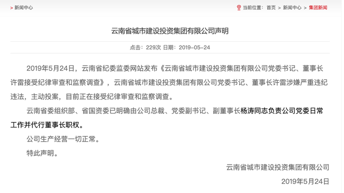 此外,公司控股股东云南省城市建设投资集团有限公司官网也发布声明称,因云南省城市建设投资集团有限公司党委书记、董事长许雷主动投案,云南省委组织部、省国资委已明确由公司总裁、党委副书记、副董事长杨涛负责公司党委日常工作并代行董事长职权。