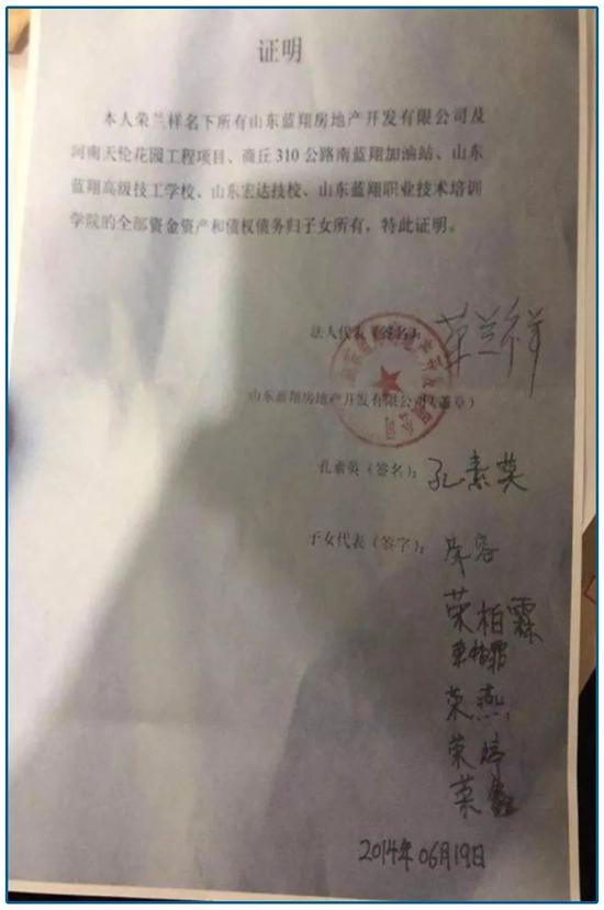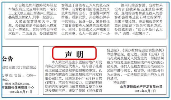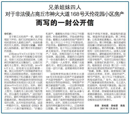 而在2017年的时候,荣兰祥的四个子女在《商丘日报》上以广告的形式发表了一封公开信,与母亲孔素英“划清界限”“大义灭亲”:
