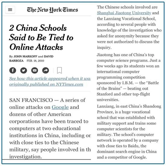 纽约时报的分析煞有介事:上海交大拥有中国顶尖的计算机科学项目,而蓝翔技校是军方支持的大型职业学校,为军方培养计算机人才,而且是百度控制的实体。