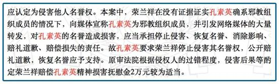 然后荣兰祥上诉说自己没有接受南都记者的采访,这是不正当的炒作行为,负面效应也是炒作的结果,要告也是告南方都市报;自己说过孔素英是信教居士,没说邪教,而且它也没有证据。