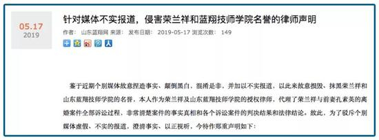 5月17日,蓝翔技校在官网上发布了一则律师声明,以律师的名义,树立起一个“辛勤劳动却被恶意抹黑“的创业者的高大形象,顺便警告一下,不要再给荣兰祥和蓝翔技校抹黑了,不然就”打官司“。