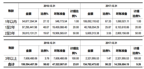 而在2018年年报中,账面显示维旺明科技的应收账款依旧为1600万,但坏账准备金已经提高至440万,但账龄结构中为1至2年的应收账款1200万,2至3年的应收账款400万,可以说与2017年1年以内及1至2年应收账款的分配比例完全相同。