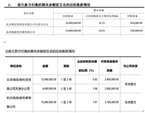 其中连续两年位列应收账款金额第一名的北京维旺明科技有限公司天津分公司,在2017年年报中显示金额为1600万,同年计提坏账准备金92万元。按照全景网络应收账款坏账计提比例计算,该笔款项中有1200万1年以内的应收账款,400万1至2年内的应收账款