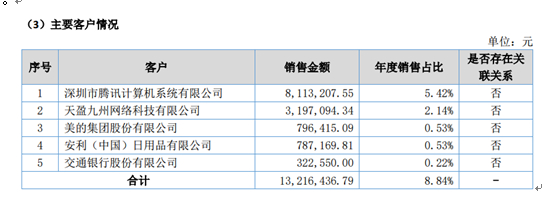在客户方面,全景网络并未对2016年和2017年前五大客户的名称信息进行详细的披露。而2018年年报上显示,其前五大客户分比为腾讯、九州网络、美的、安利以及交通银行