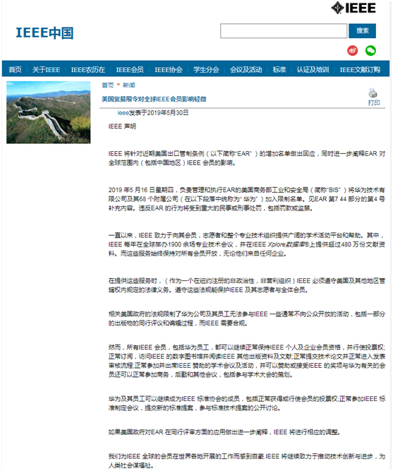 [环球网综合报道]5月30日,国际电气与电子工程师协会(IEEE)在其中文官网发布声明承认限制华为员工的参与审稿。声明称,“相关美国政府的法规限制了华为公司及其员工无法参与IEEE一些通常不向公众开放的活动,包括一部分的出版物的同行评议和编辑过程,而IEEE需要合规。”声明还称,但华为员工可以继续正常保持IEEE 个人及企业会员资格,并行使投票权。