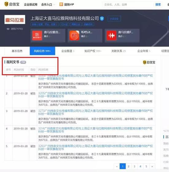 其次,喜马拉雅的风险到底在哪?其实对于喜马拉雅来说,其主要提供的产品和服务就是互联网语音内容服务,所以喜马拉雅就是一个业务非常明确的内容平台,但是喜马拉雅现在面临最大的风险就是内容版权问题,根据启信宝的数据我们可以看到,喜马拉雅涉及到著作权的各种判决文书已经达到了799项,可见当前喜马拉雅版权问题的复杂。我们可以看到无论是的爱奇艺还是哔哩哔哩其上市的最核心问题就是要解决版权问题,否则版权将有可能成为悬挂在互联网内容公司头上的达摩克利斯之剑,但是这又是一个两难循环的问题,因为要解决版权问题必然需要海量的资金,随着中国版权意识的逐渐觉醒,涉及到版权购买的资金将会非常巨大,但是在喜马拉雅没能实现上市之前,他的资金来源又是相对有限,可见喜马拉雅资金压力的巨大。