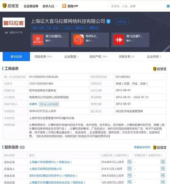 4月8日下午,2018年12月19日至2019年3月13日,喜马拉雅FM23位股东出质股权,质权人为喜丈(上海)网络科技有限公司,该公司为喜马拉雅(香港)有限公司的全资子公司。喜马拉雅FM主体公司为上海证大喜马拉雅网络科技有限公司,该公司目前共有23家股东。