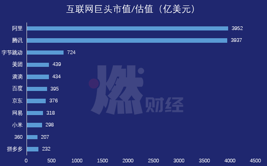 互联网巨头市值/估值(亿美元) 制图 / 燃财经