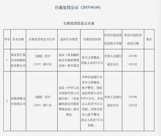 新京报讯(记者 宓迪)记者今日从央行南京分行网站获悉,南京苏宁易付宝网络科技有限公司、双乾网络支付有限公司近日由于违反相关规定,收到了中国人民银行南京分行开出的罚单。