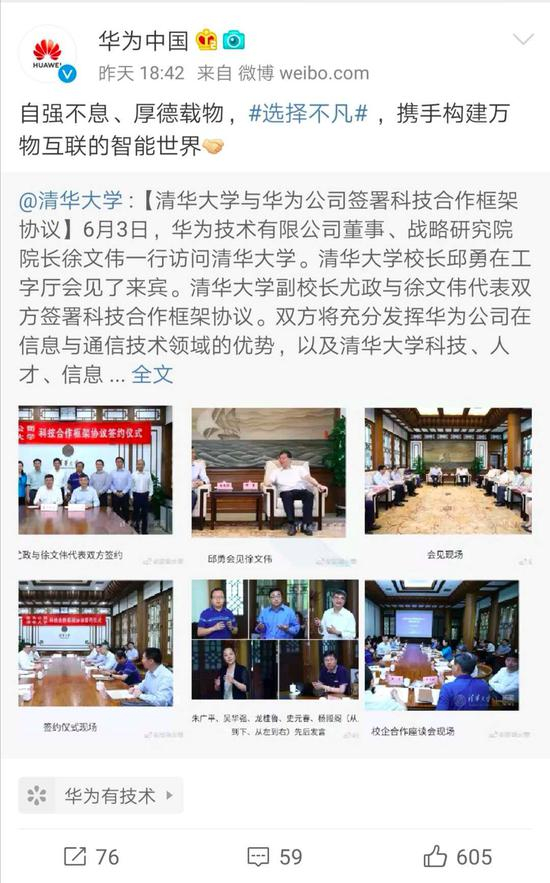 据清华大学官微发布的消息,6月3日,华为技术有限公司(以下简称“华为公司”)董事、战略研究院院长徐文伟一行访问清华大学。清华大学校长邱勇在工字厅会见了来宾。清华大学与华为公司签署科技合作框架协议,促进双方合作迈向新台阶。