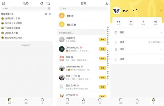 体验下来,狐友APP整体分为“动态”、“互关”、“我”。“动态”类似于微博信息流,可在其中查看关注好友所发内容;“互关”类似于通讯录,又有我的群聊入口;“我”则主要是基础功能设置。