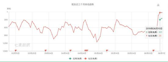 狐友早在2018年即推出测试版,但一直没有激起什么水花。据七麦数据显示,狐友近三个月的排名在6月10日达到峰值,也仅为免费榜301,社交榜26,之前未推出正式版时都在社交榜的500名开外。