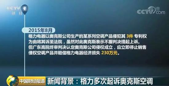 2015年8月,格力电器以奥克斯公司生产的某系列空调产品侵犯其3件专利权为由将其诉至法院,虽然对此奥克斯表示不服判决提起上诉。但广东高院终审判决认定奥克斯公司侵权成立,应立即停止销售侵权空调产品并赔偿格力电器经济损失230万元。