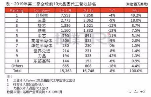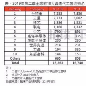 拓墣产业研究院发布的2019年Q2季度全球TOP10晶圆代工厂榜单中,台积电以75.53亿美元的营收位居第一,市场份额达到了49.2%,几乎占据半壁江山;三星以27.73亿美元的营收位列第二,市场份额18%。