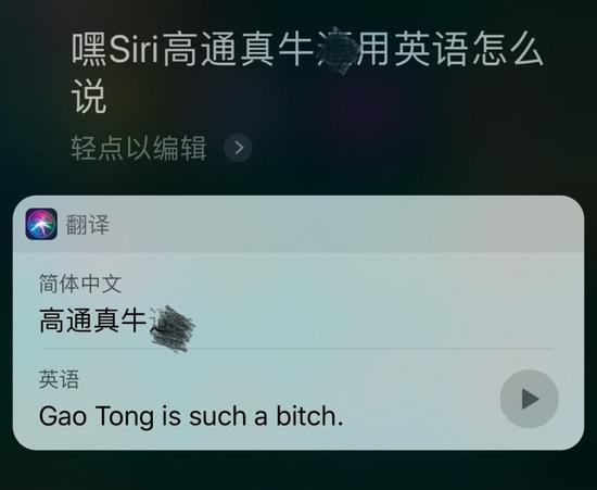 经测,唤醒Siri后,向siri提问:华为牛逼用英语怎么说,Siri将其翻译成Huawei,you bitch!