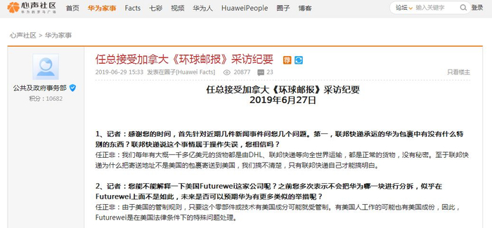 6月29日下午,华为心声社区发布了日前任正非在接受加拿大《环球邮报》采访时的纪要。在采访中,任正非就联邦快递、实体清单、华为专利费、5G、孟晚舟事件、加拿大投资等众多问题进行了解答。