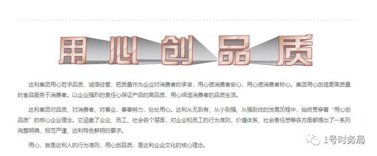 官网还介绍说:达利集团用心苛求品质,诚信经营,把质量作为企业对消费者的承诺,用心使消费者安心,用心使消费者称心。集团用心创造更高质量的食品服务于消费者。以企业强烈的责任心保证产品的高品质,用心缔造消费者的品质生活。