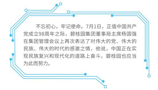 碧桂园集团党委书记、集团总裁莫斌表示,碧桂园始终以党建为引领,打造有社会责任感的企业文化,我们每一名党员,都要努力提高自身政治素养和文化修养,平衡好个人发展、服务企业和服务社会之间的关系,身为碧桂园的员工,都应“不忘初心,牢记使命”,勇敢地肩负起“希望社会因我们的存在而变得更加美好”的企业使命。