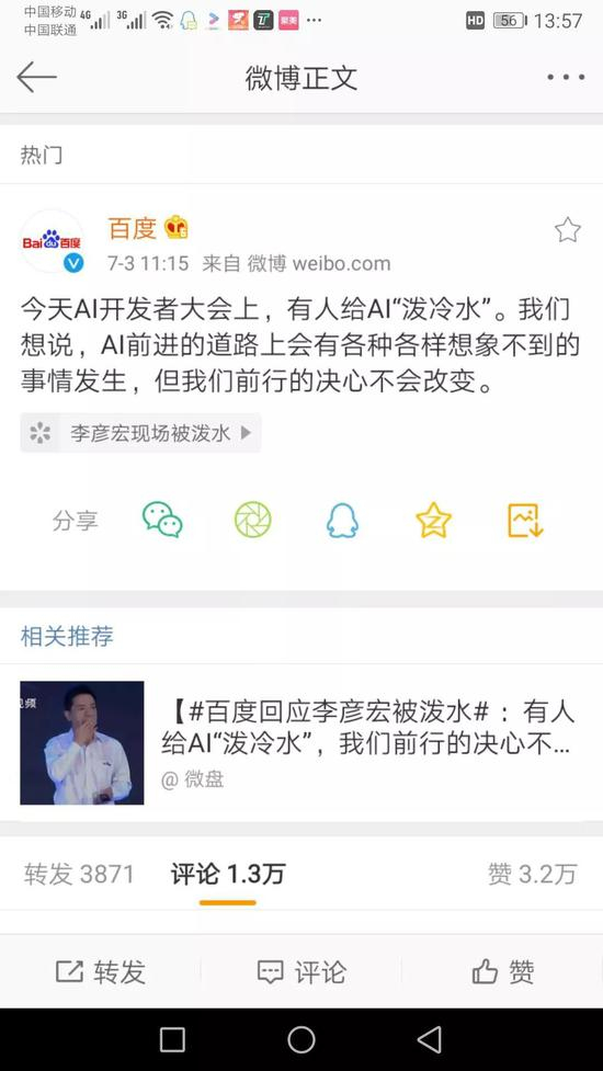 但随后,百度官方微博回应称,今天AI开发者大会上,有人给AI“泼冷水”。我们想说,AI前进的道路上会有各种各样想象不到的事情发生,但我们前行的决心不会改变。