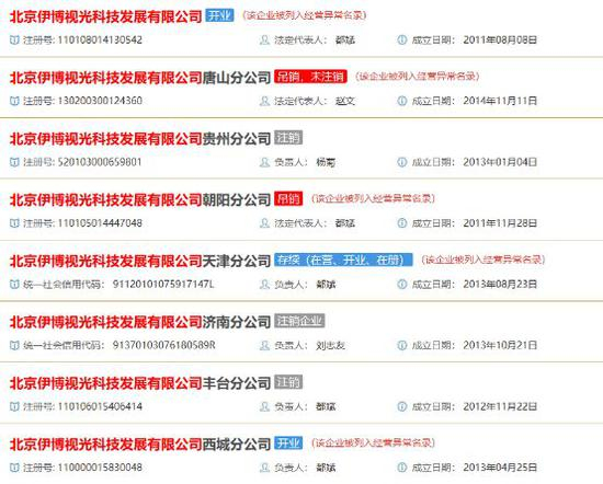 《中国消费者报》查询有关企业信息网站系统发现,伊博公司除北京公司外还在多地开设了分公司,但均处于“列入异常名录”或吊销、注销状态。