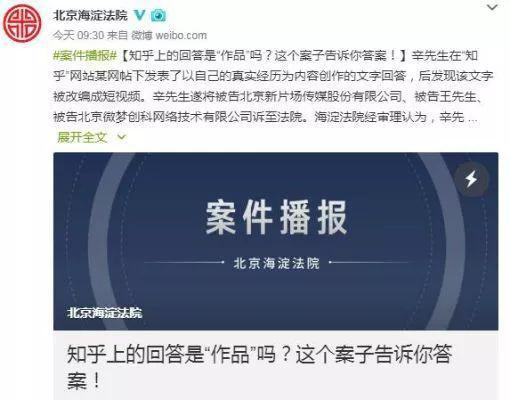 该案件一经发布,便引起业内的关注,并就知乎问答也可视为享有著作权的权利作品进行讨论。然而,知乎问答被侵权一事并非是在该案件中首次发生,2017年知乎曾诉微博账号“大神说”侵害作品信息网络传播权,不仅未经知乎用户许可便擅自转载问答,从而获得大量关注,还进行广告经营谋取巨额经济利益。