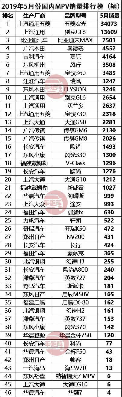 ▲2019年5月份国内MPV销量排行