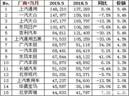 根据第三方数据机构最新公布的2019年5月份国内汽车厂商销量排名显示,国内各汽车厂商出现冰火两重天的业绩表现。