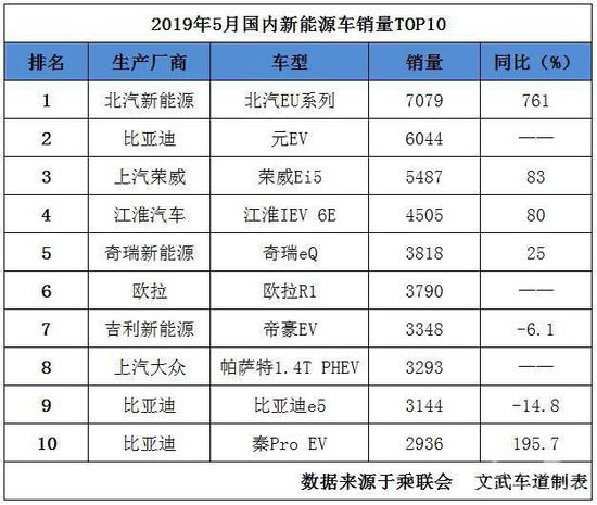 根据乘联会公布的2019年5月份新能源汽车最新销量数据显示,2019年5月,北汽EU系列、比亚迪元EV、荣威Ei5、江淮IEV 6E、奇瑞eQ、欧拉R1、帝豪EV、帕萨特1.4T PHEV、比亚迪e5与比亚迪秦Pro EV位列新能源车销量前十。