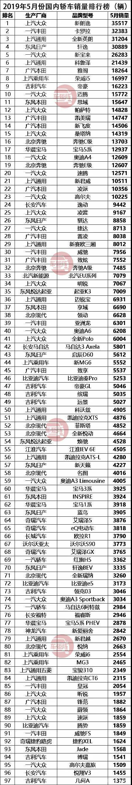 ▲2019年5月份国内轿车销量排行榜