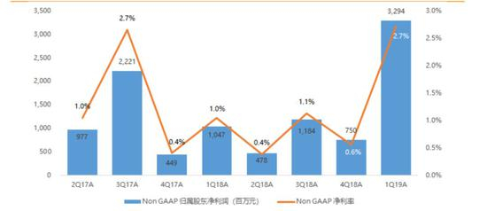 根据京东2019年Q1财报数据显示,京东该季度净收入同比增长20.9%至1210.8亿元,超市场预期0.8%,Non-GAAP下归属股东净利润同比增长214.5%至32.9亿元,是2018年全年的95.2%。
