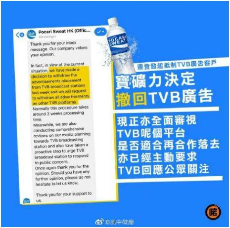 相关新闻:TVB“挺警察”被宝矿力水特撤广告?公司日本总部确认